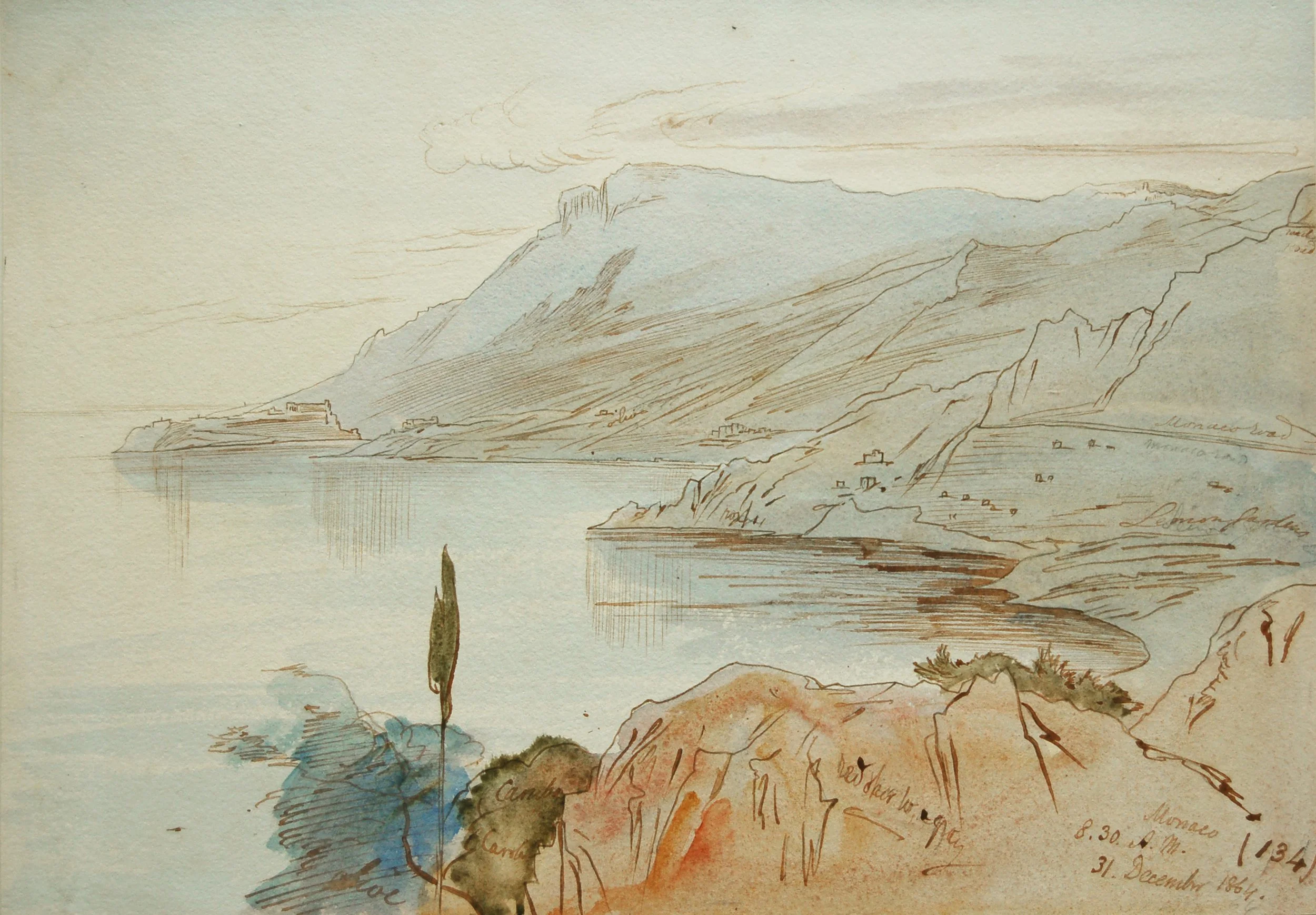 Monaco from Cap Martin. Pen and Wash 1864 9 × 12 inches